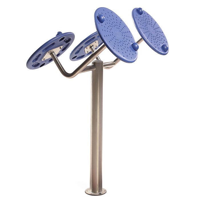 Twister: Stellen Sie sich aufrecht auf die Drehscheibe und umfassen Sie den Griff. Drehen Sie die Hüfte nach links und rechts und achten Sie darauf, die Schultern gerade und stabil zu halten.