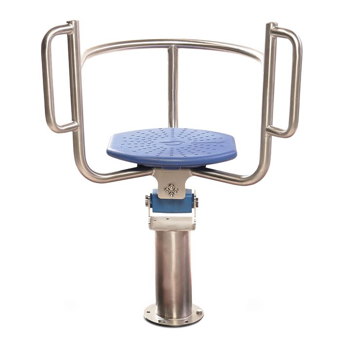 Stellen oder setzen Sie sich aufrecht auf die Drehscheibe und umfassen Sie den Griff. Drehen Sie die Hüfte nach links und rechts und achten Sie darauf, die Schultern gerade und stabil zu halten.