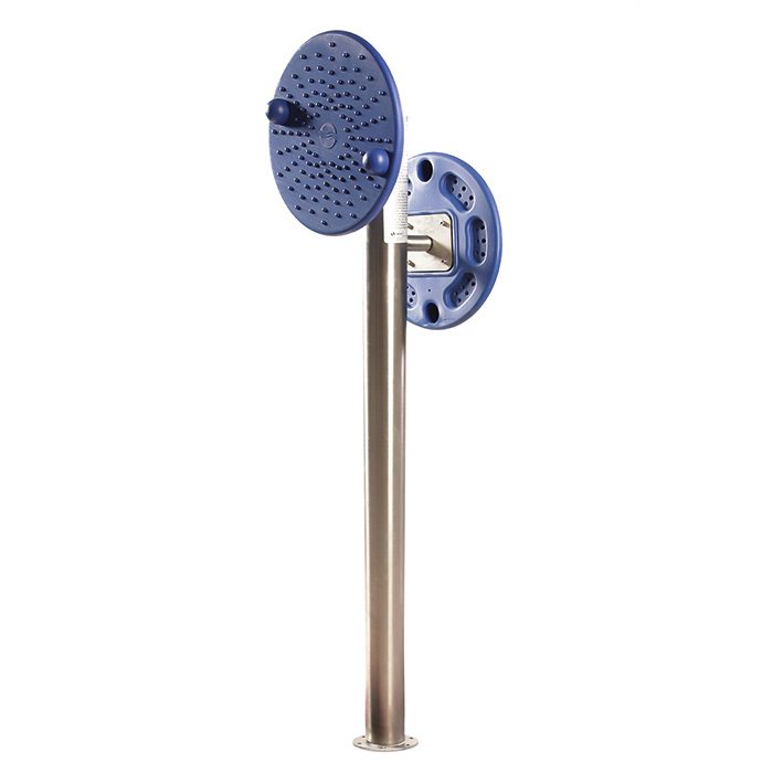 Legen Sie Ihre Hand auf eine Halbkugel der Drehscheibe und drehen Sie diese abwechselnd in beide Richtungen. Zur Massage legen Sie eine Handfläche auf die Scheibe und drehen diese.